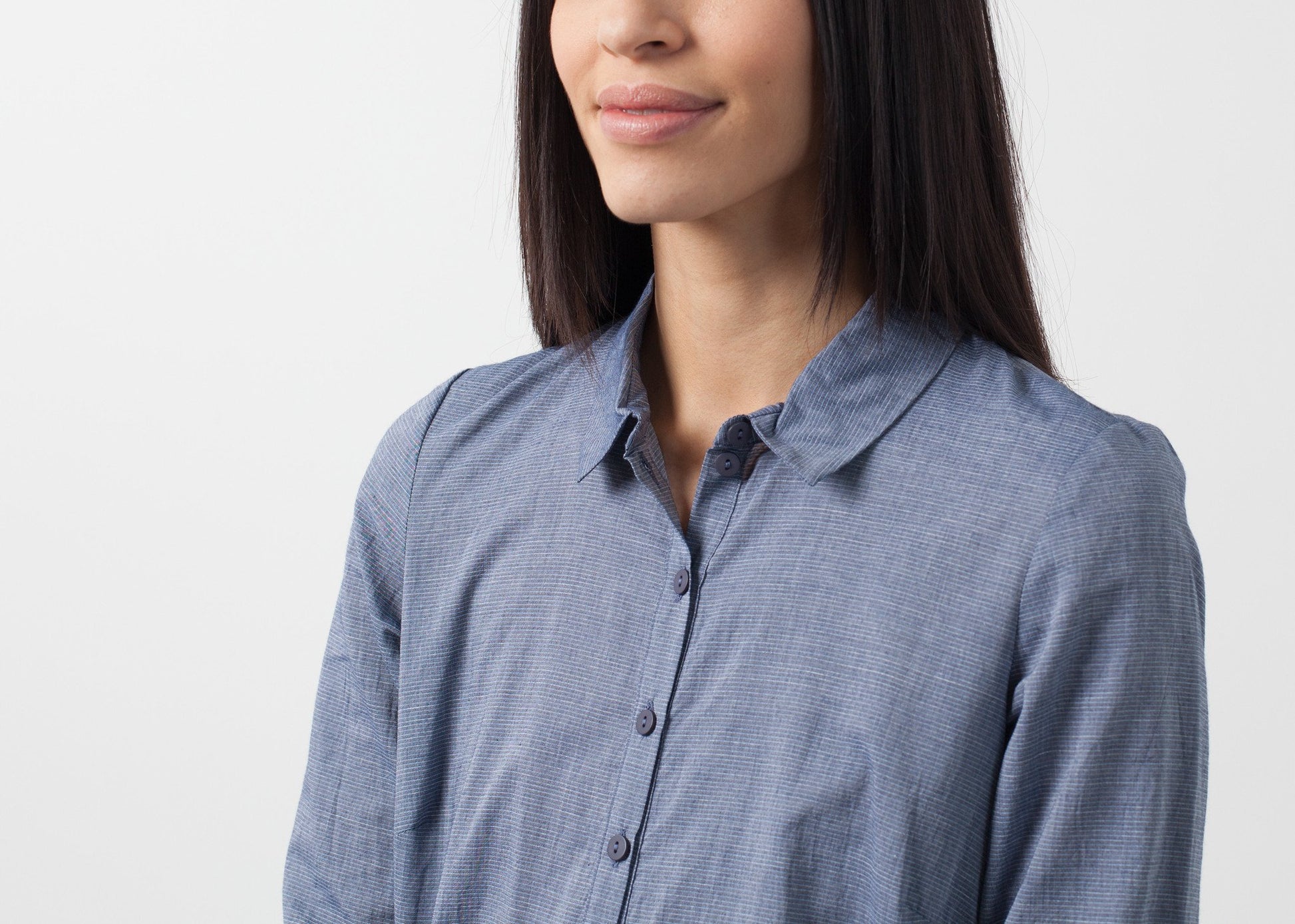 The Romary is a glamified shirtdress with fancy details. Gathered details at sides. Button placket closure at front. Knee length. Lilith. Color Rock. 100% Cotton. Ashley is wearing an X-Small.